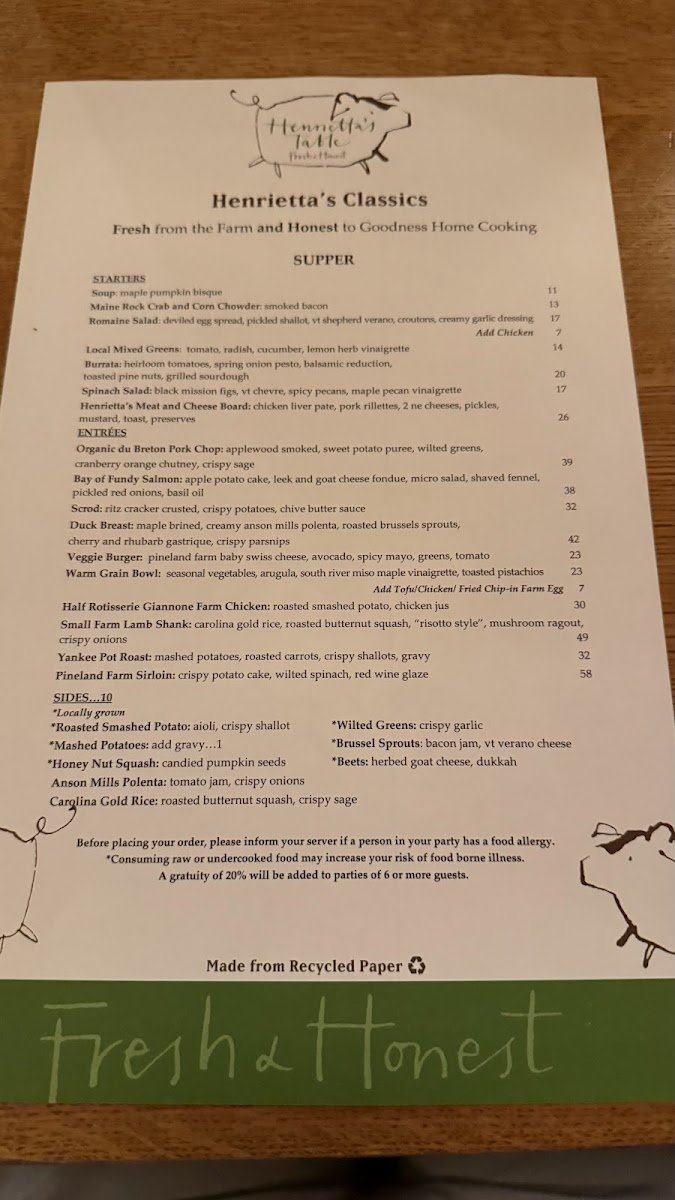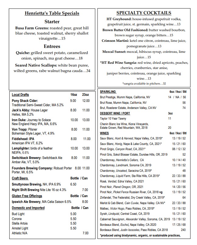 Henrietta's Table offers a diverse menu that's both comforting and innovative. Start your meal with the Maine Rock Crab And Corn Chowder, a rich and velvety dish elevated by smoky bacon that dances on your palate. If you're in the mood for something lighter, the Spinach Salad is a refreshing choice, bursting with seasonal fruits and drizzled with a spicy maple pecan vinaigrette that perfectly balances sweet and savory notes. For an indulgent touch, don’t miss the House Smoked Pastrami Salmon, artfully plated with crispy potato wafer and Vermont crème fraiche — it’s a harmonious blend of flavors you'll relish.
